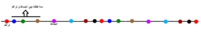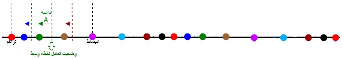 مرحله 2 : تعداد ذرات بین ذرات قرمز و بنفش را تعیین می کنیم و فاصله بین تراکم و انبساط را به این تعداد و با سه خط به صورت مساوی تقسیم می کنیم.در اینجا تعداد ذرات بین قرمز و بنفش سه عدد است پس فاصله را، به کمک سه خط، به چهار قسمت مساوی تقسیم می کنیم تا وضعیت تعادل نقاط دیگر هم بدست آید.فاصله نقطه وسطی(نقطه سبز)از وضعیت تعادلش همان دامنه موج طولی است.شکل(8)