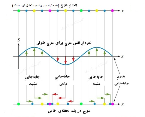 ثانیا: برخلاف موج عرضی که وضعیت تعادل تمام ذرات محیط مشترک و همان محور افقی شکل موج است در موج طولی هر نقطه، وضعیت تعادل مخصوص به خود را دارد که همان وضعیت نقاط قبل از رسیدن موج به محیط است پس به تعداد ذرات محیط، وضعیت تعادل وجود دارد.شکل(2)