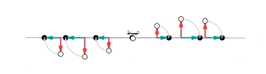 ب) نقاطی که در همسایگی یک انبساط قرار دارند، از دو طرف از این نقطه نسبت به وضع تعادل خود جابجا شده اند، به طوری که نقاط واقع در همسایگی راست آن ،سمت راست و نقاط واقع در همسایگی چپ آن، سمت چپ وضع تعادل خود هستند و نقطهی واقع در انبساط در وضع تعادل خودش است.بنابراین وضعیت جابجایی ذرات محیط نسبت به وضع تعادلشان به سمت چپ و راست مشخص می شود ،که جابجایی به سمت راست،مثبت و به سمت چپ،منفی است.شکل(3)