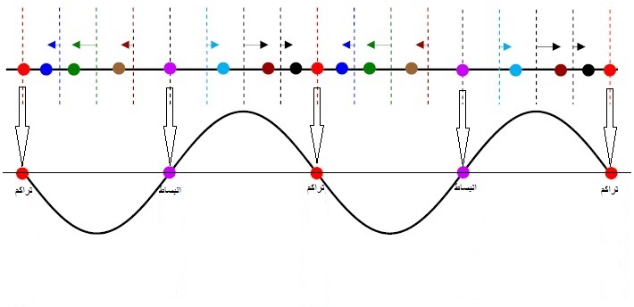 هشدار مهم : در تمامی عبارتهای بالا، "جابجا شدن جسم نسبت به وضع تعادل "مورد بررسی قرار گرفته است که معنی آن همان بردار مکان جسم نسبت به نقطه تعادل است،عدم دقت ممکن است خواننده محترم را دچار این اشتباه کند که جابجایی مثبت از وضع تعادل ،به معنی سرعت مثبت است در حالی که سرعت به جابجایی لحظه ای بستگی دارد نه بردار مکان(یا همان جابجایی نسبت به وضع تعادل) .به عنوان مثال برای موجی که به سمت راست منتشر می شود، نقاط در همسایگی چپ و راست تراکم همگی سرعت مثبت دارند درحالی که جابجایی از وضع تعادل آنها قرینه است.شکل(6)